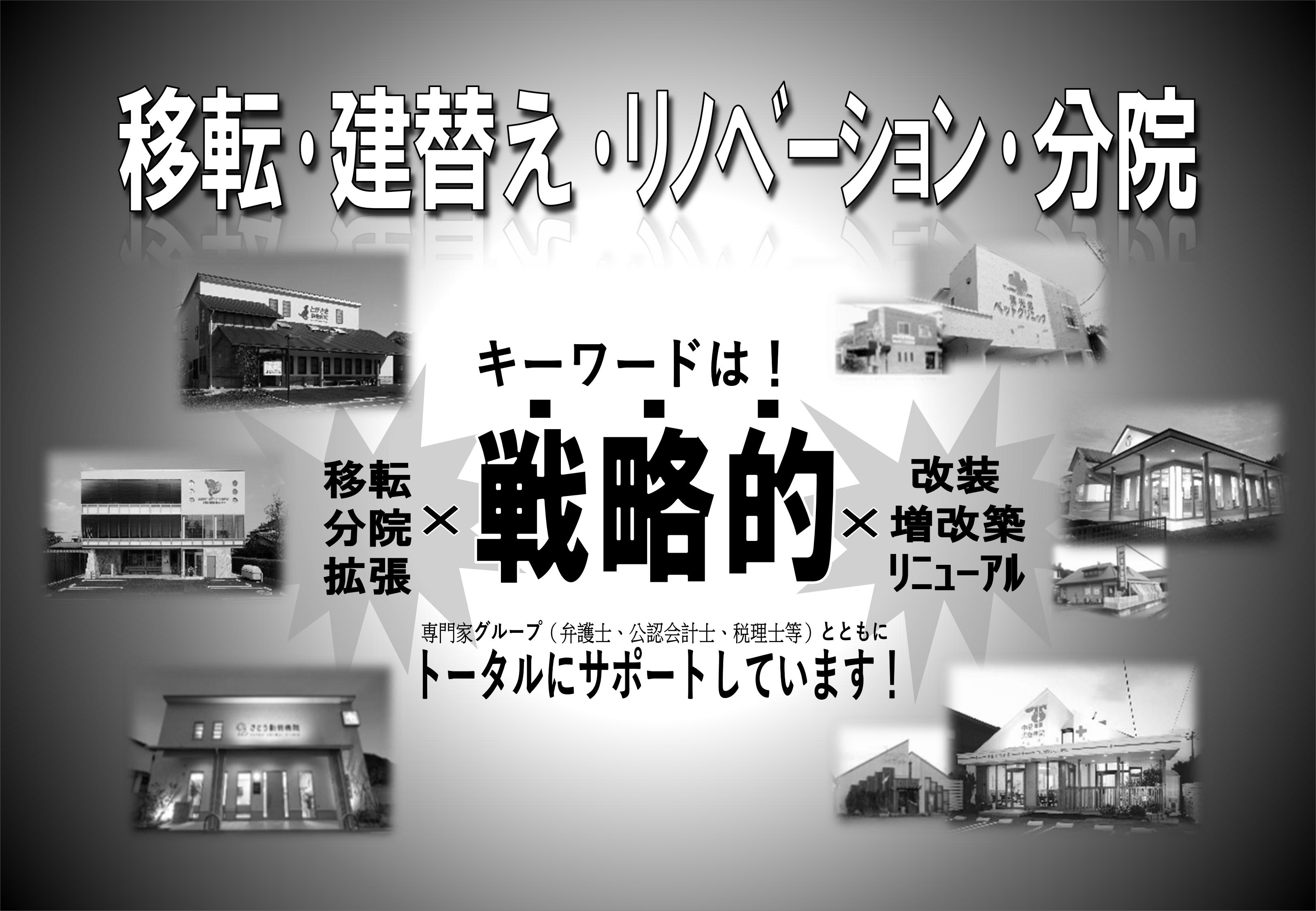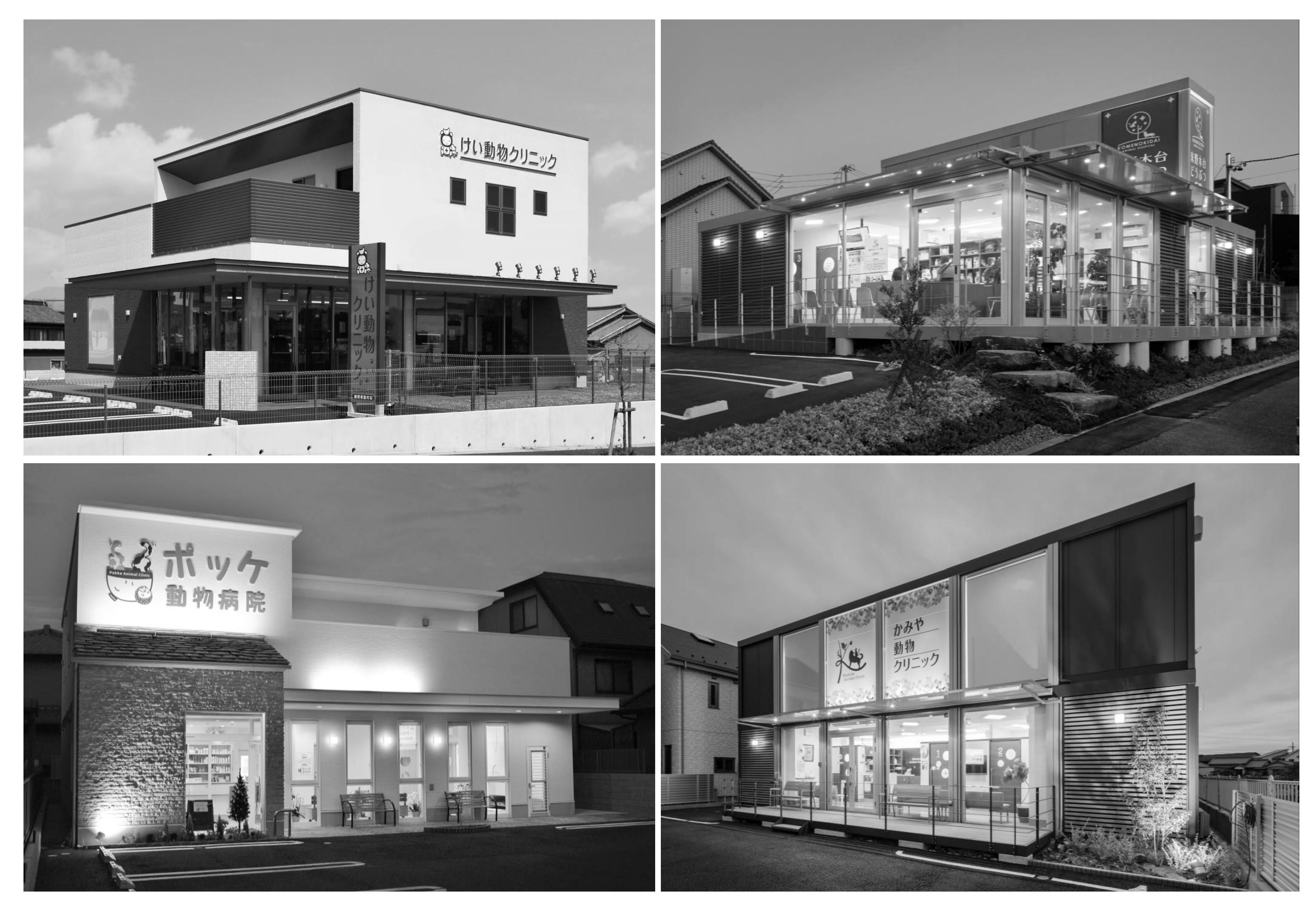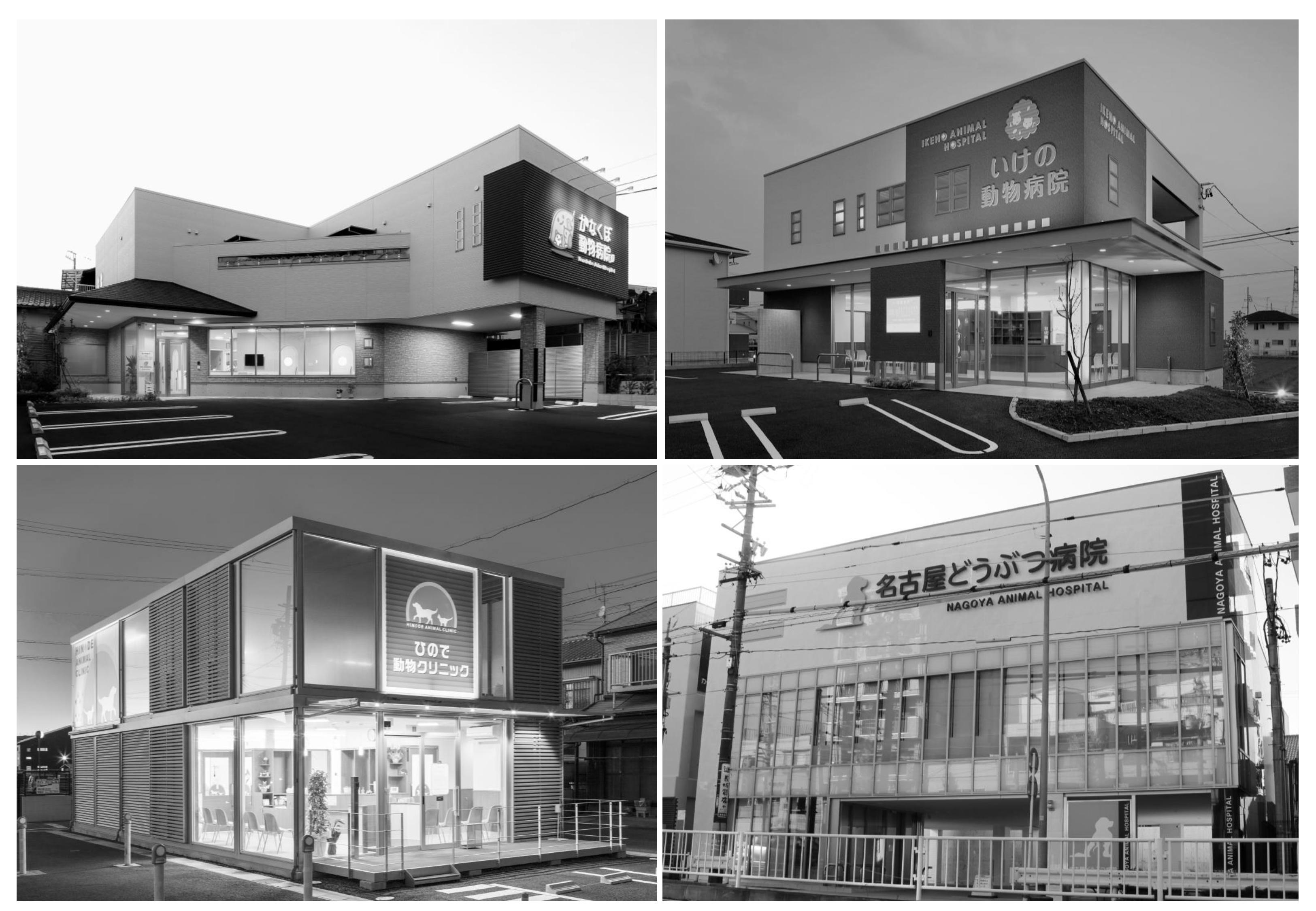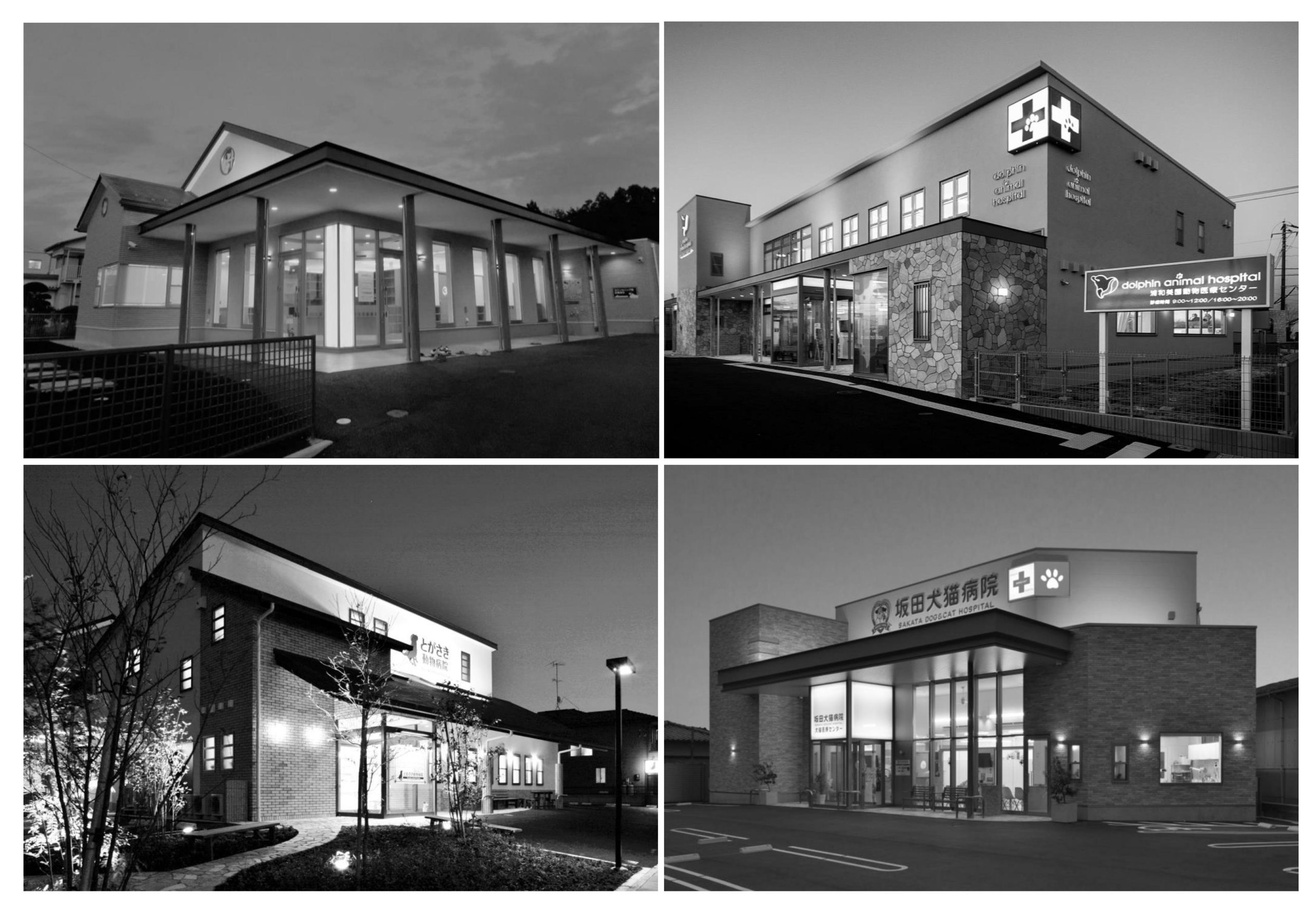 各先生方と共に—コツコツ!—全力投球!—「戦略的動物病院」—全国各地で約200数件—今日現在も、新たな御手伝いが進行中です。病院のデザイン、設計、監理はもとより、新規開業では、マーケティング、需要予測、事業計画、税務・資金調達等コンサルティング、開業物件捜索まで—移転・拡張・建替え・リノベーション計画では、「戦略的」をキーワードにアイテムの抽出、組立てから、ホップ・ステップ・ジャンプへ——