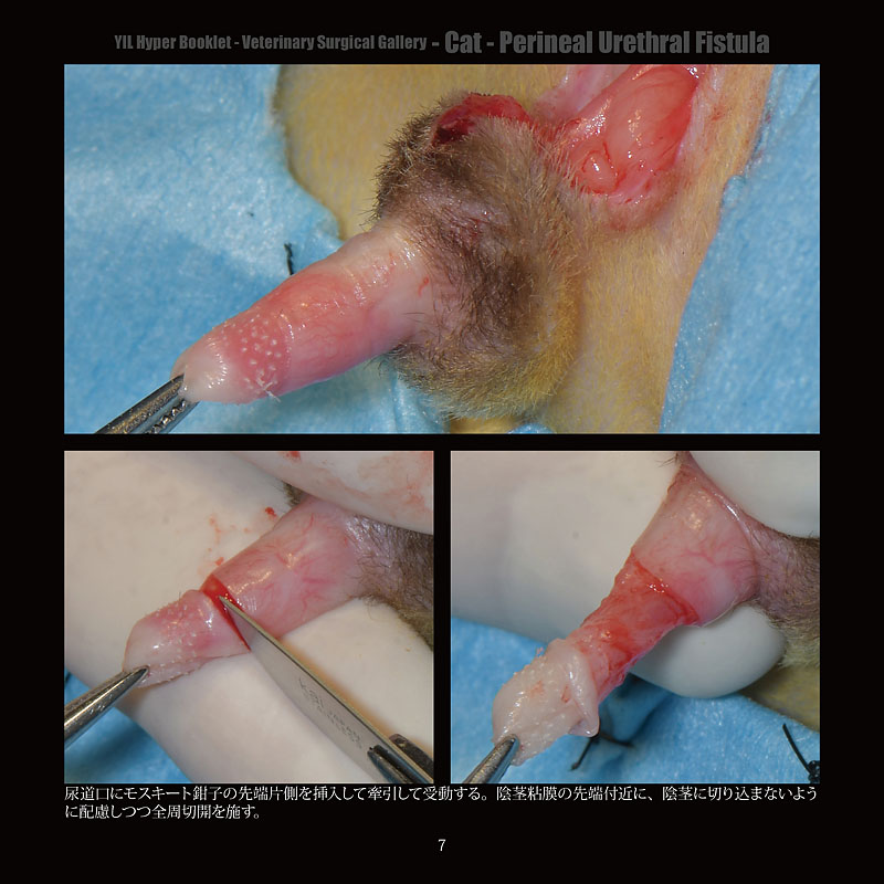 本書では、これらWilsonの手法による術後合併症を回避することができる、包皮転移によるオリジナルの手技を紹介したい。この手法は座骨海綿体筋や陰茎脚の切断を必要としないために簡便であり、さらに、尿道の露出がないために術後合併症の発生率がきわめて低い優れた手技である。ぜひ日常の臨床でこの手技を使用し、雄猫の尿道障害を解決してあげてほしい。